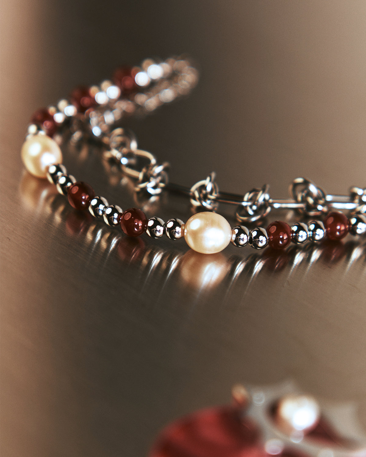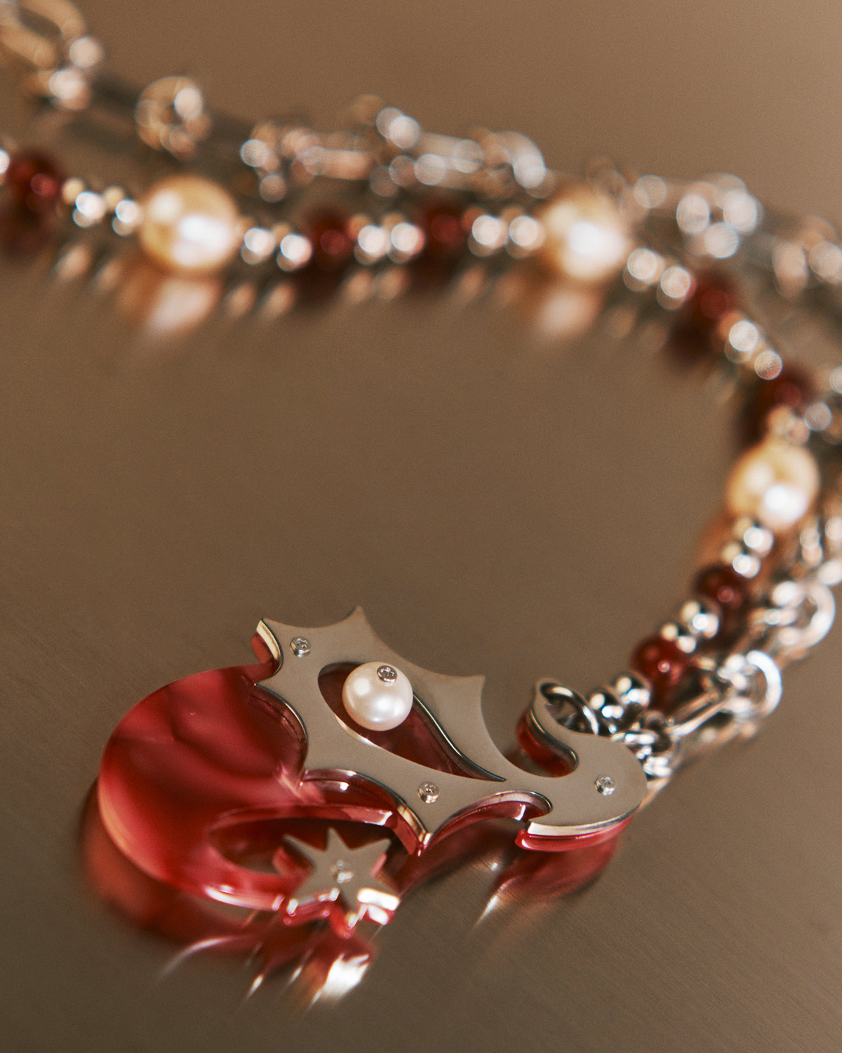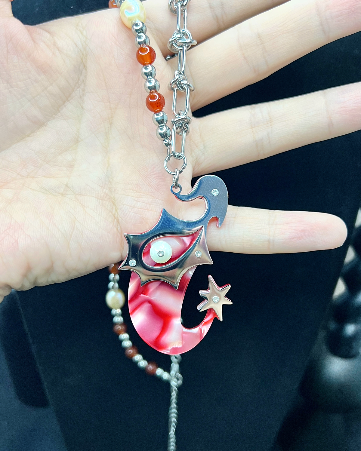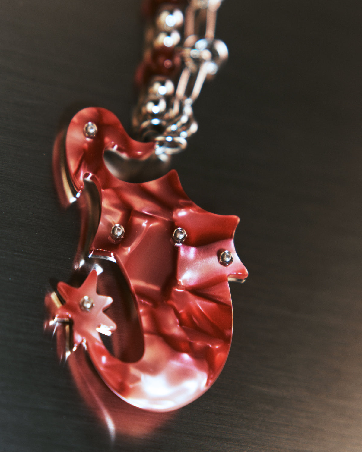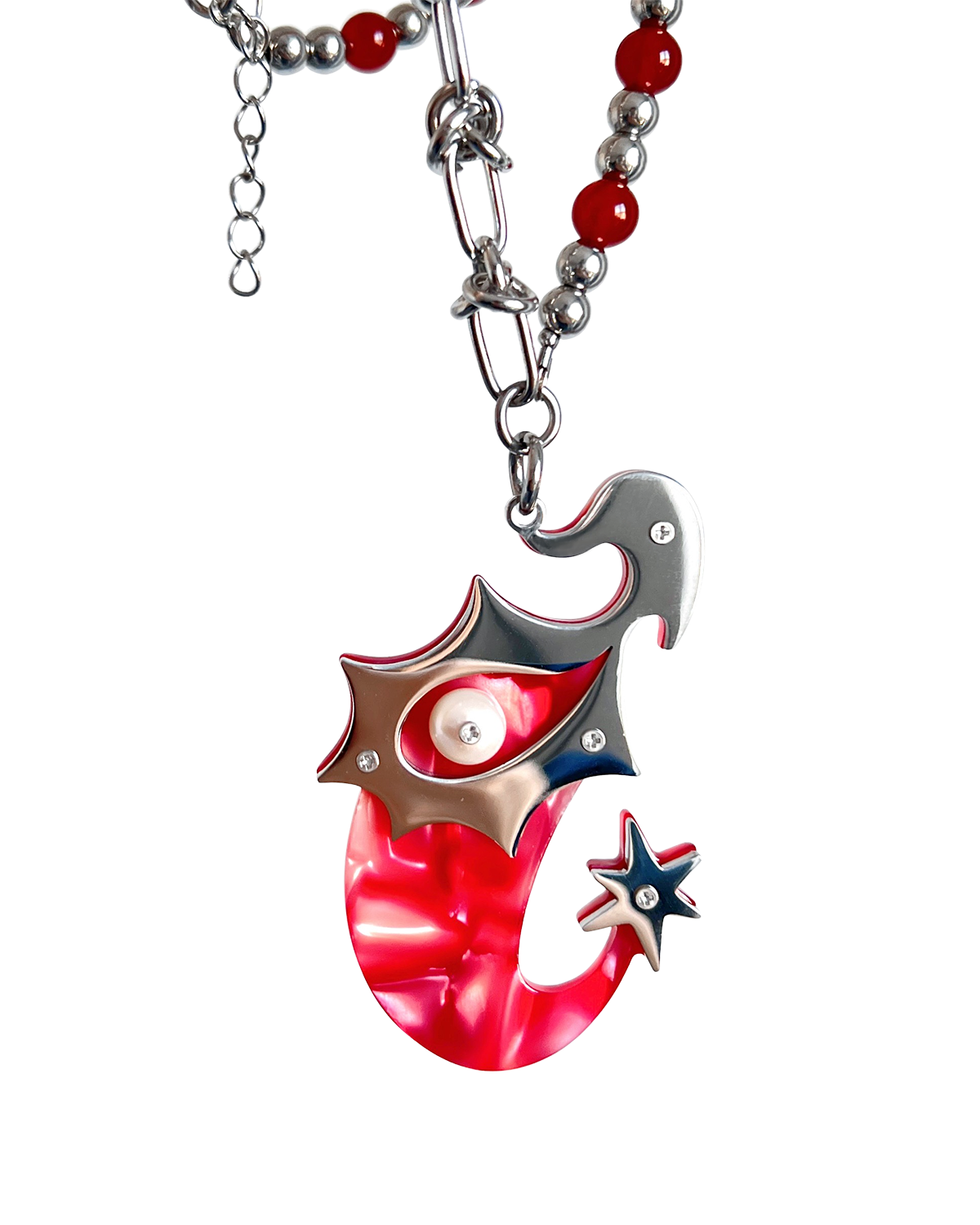 An alien-like pendant inspired by the form of a carnivorous pitcher plant. Crafted from stainless steel, red-patterned acetate, freshwater pearls, and a sculpted eye detail. The chain alternates between two structures.Polished steel links and segments of carnelian and pearl beads.