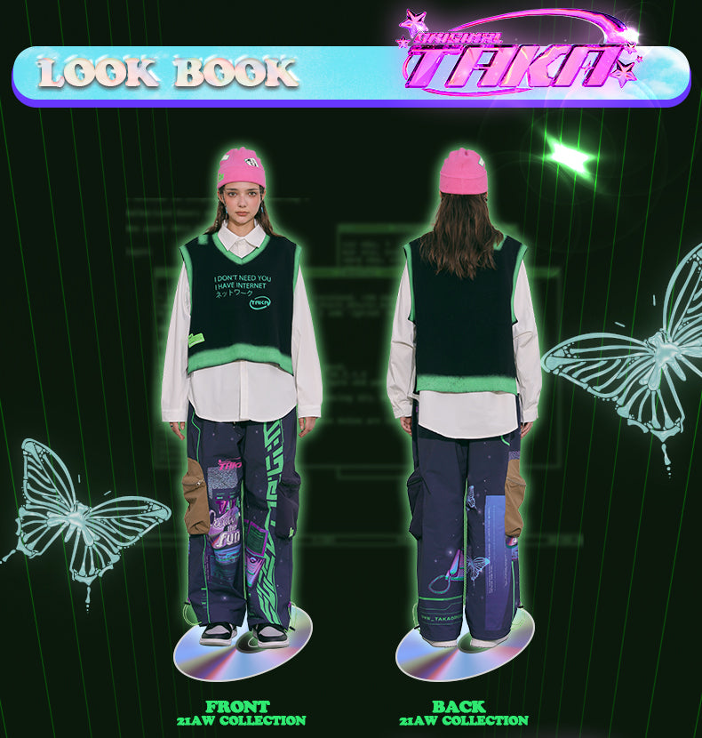 The model is also styled with TAKA Original [ Eternet 001] cargo pantsTAKA Original [ Eternet 001 ] anime logo patch ribbed knit beanie hat