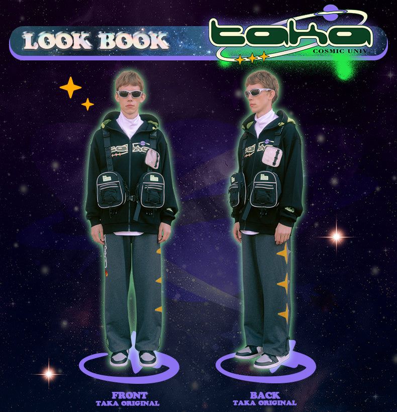 The model is also styled with TAKA Original Cosmic Univ. star print sweatpants and TAKA Original [ ETERNET 001 ] Tactical Vest with detachable bag