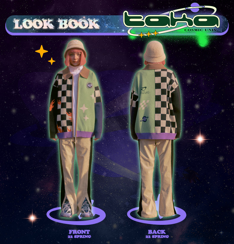 The model is also styled with TAKA Original Cosmic Univ. textured-finish bucket hat and TAKA Original Cosmic Univ. corduroy trousers