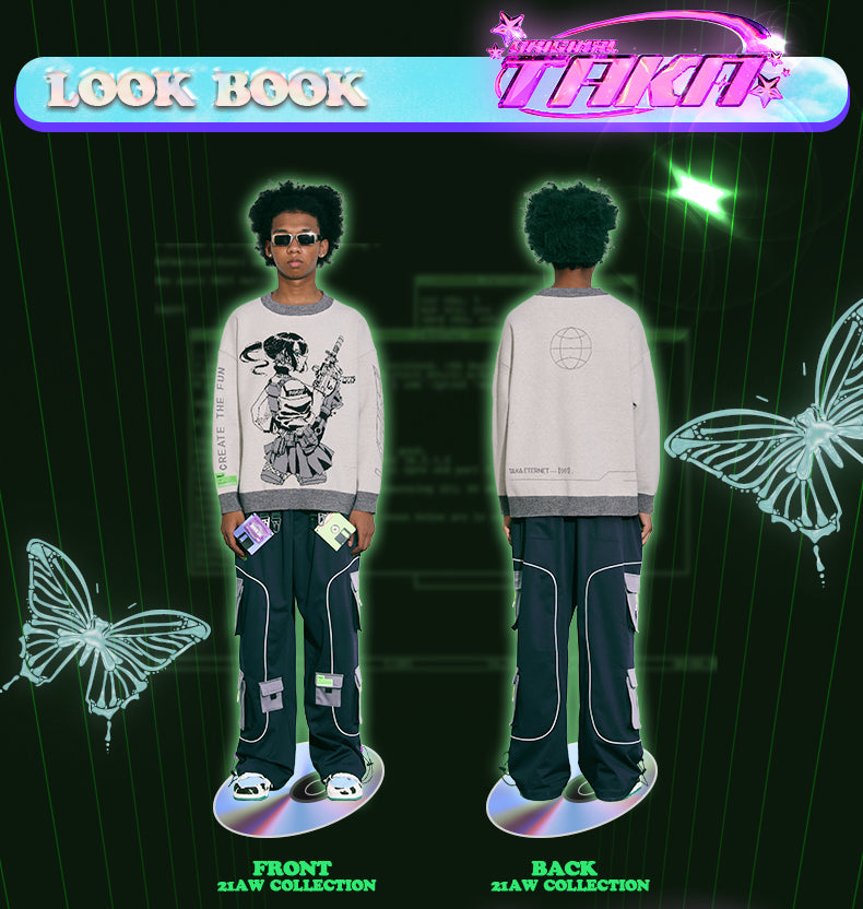 We transforms the cyberwave retrowave atheistic with a visual identity that reaches the iconic anime girl. This is a collaboration with @vinne.art. Comfort and elegance our mission. TAKA Original offers eye-catching pieces with detailed all over this black 100% cotton knit jumper. Is Adorened with anime girl print to the front for a playful finish. Hightlights: anime graphic print to the front. Crewneck.Long sleeves. Straight hem.