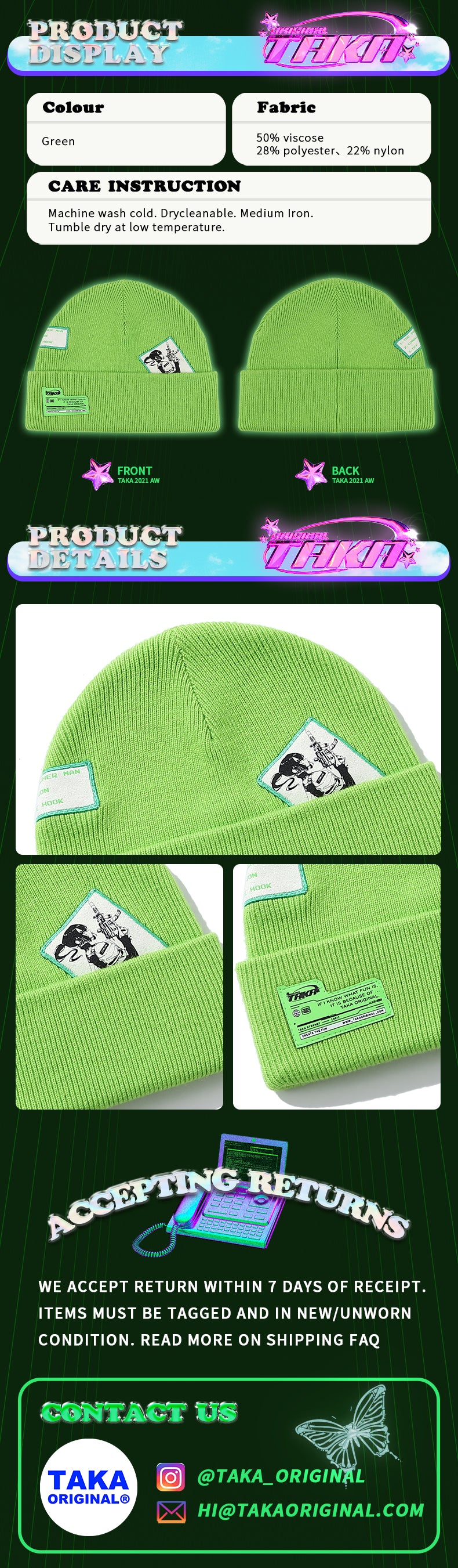 A beanie hat is a practical winter accessory that enhance with any looks. Beside good quality let’s face it, the signature [TAKA Eternet 001] anime girl patch on this beanie may look unimpressed. Featuring a knitted construction, this TAKA Original beanie will let everyone know how cool you are. Metaphorically speaking, of course. Knit hat ribbed knit round crown turn-up brim slip-on style 50% viscose 28% polyester 22% nylon with black rose pink neon green travis brown color.